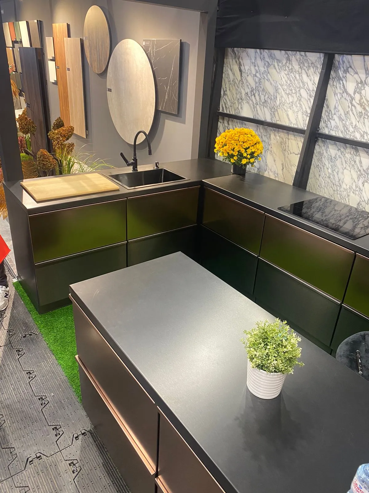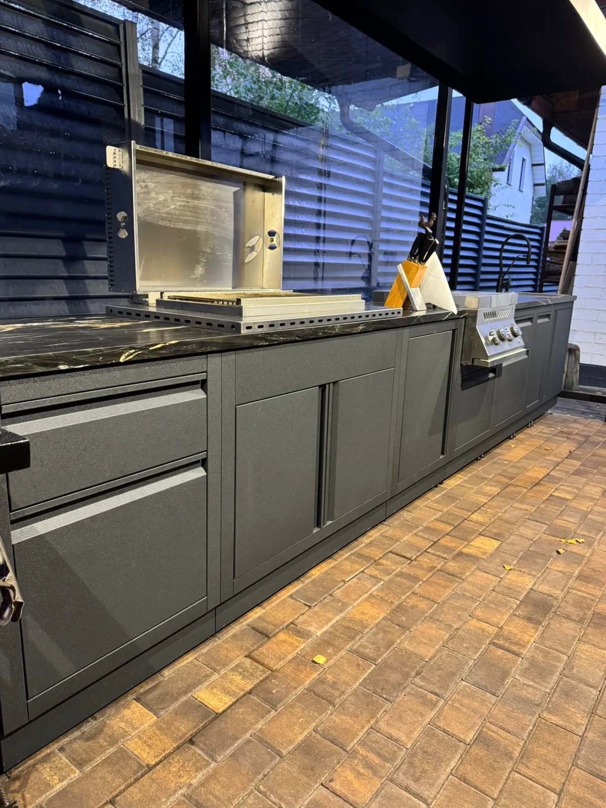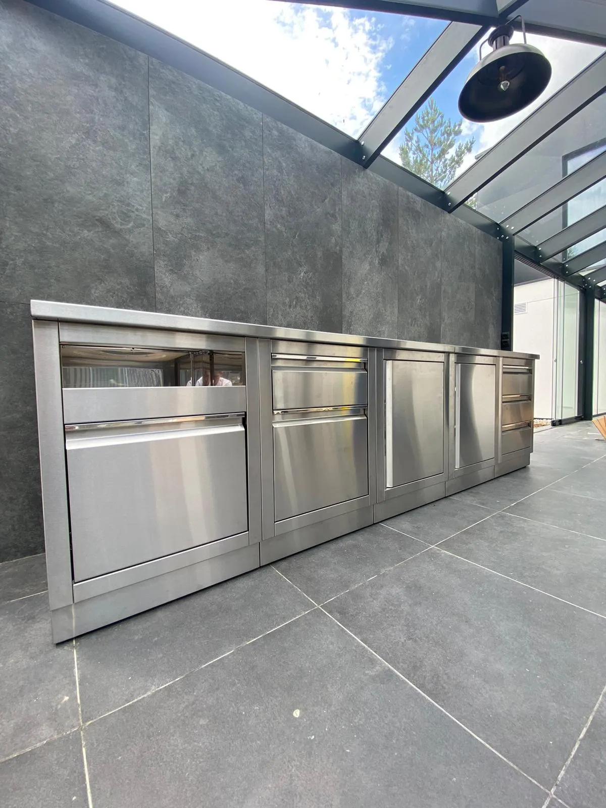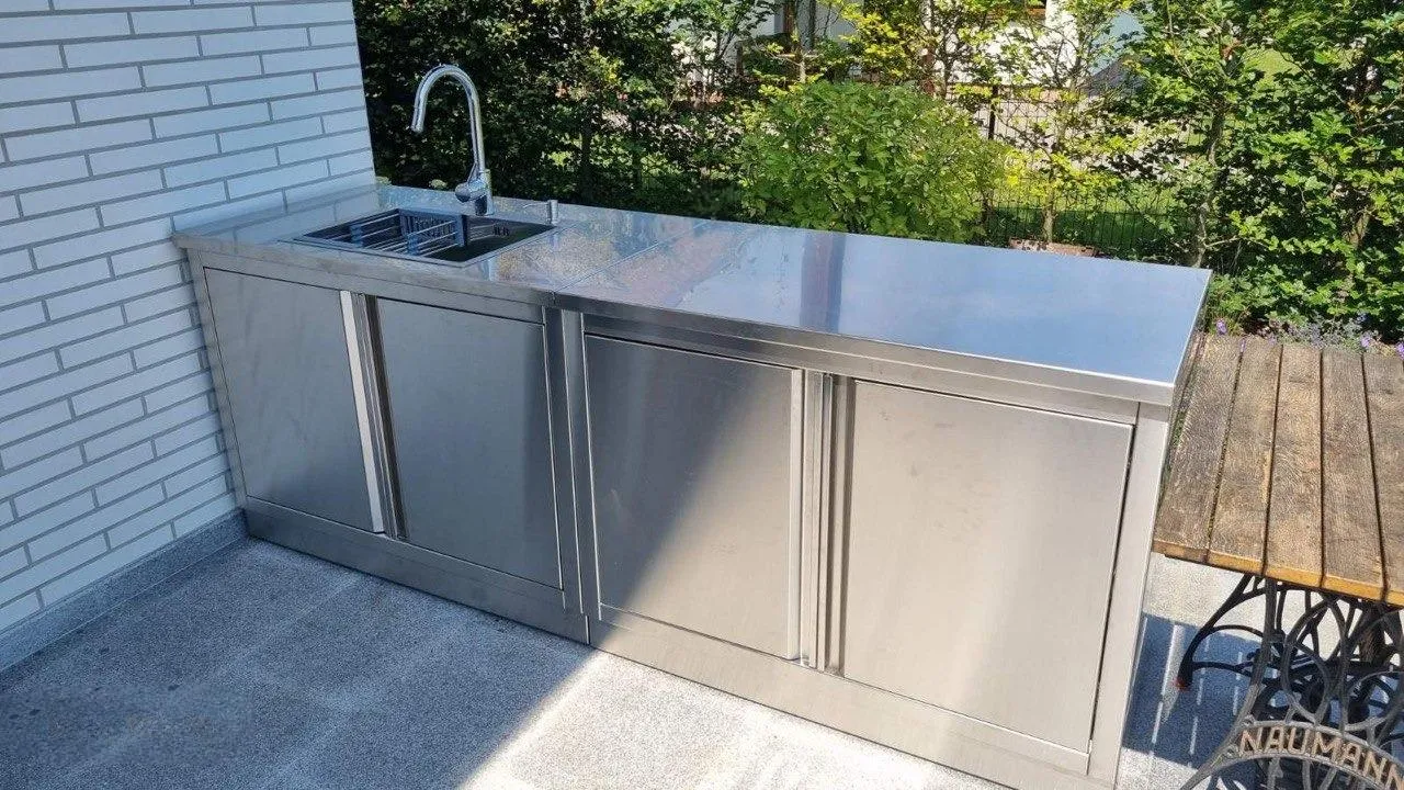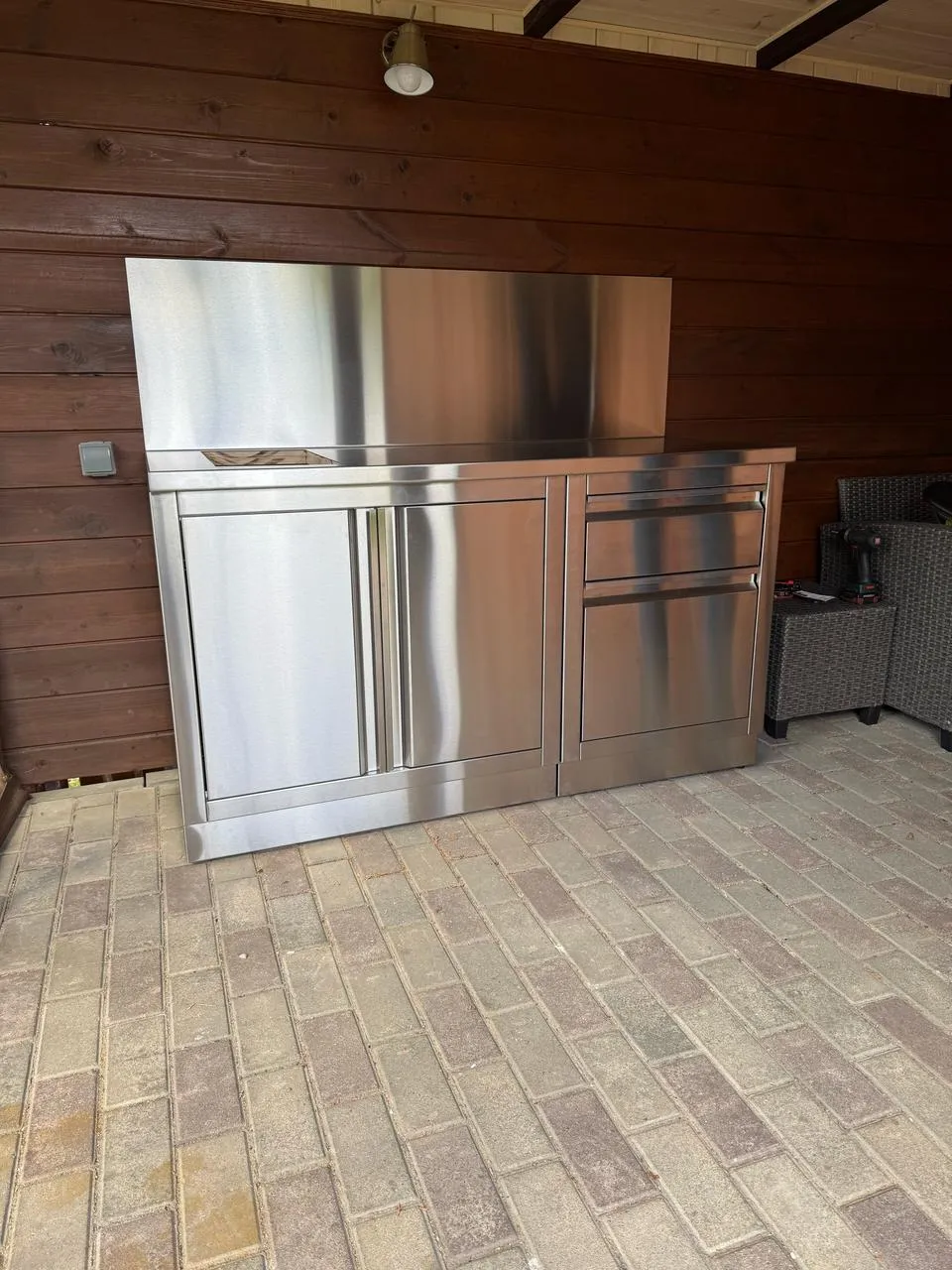 Комплект кухни из стали для дома и улицы: прямая, угловая, п-образная, напольные и навесные шкафы.